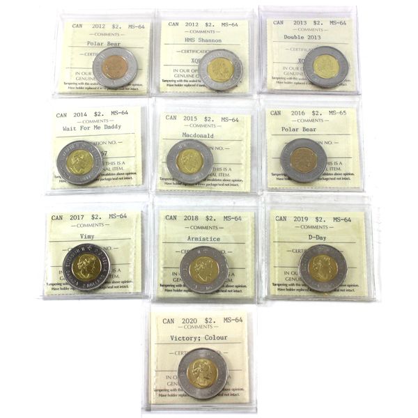 $2 Lot 2012-2020 ICCS Certified MS64 & MS65 - 2012, 2012 HMS Shannon, 2013 Double 2013, 2014 Wait For Me Daddy, 2015 Macdonald, 2016 (MS65), 201...
