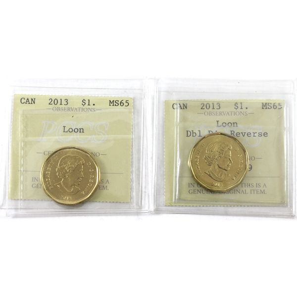 $1 2013 Loon Dbl Die Reverse & Loon PCCS (Professional Coin Certification System) MS65. 2pcs.