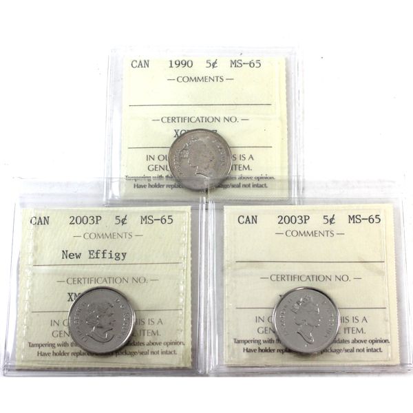 5-cent 1990, 2003P & 2003P New Effigy All ICCS MS65. 3pcs.