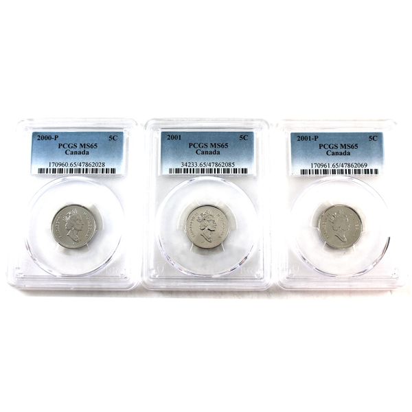 5-cent 2000-P, 2001 & 2001-P PCGS MS65. 3pcs.