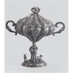 Lemberg, 1835, antik ezüst, "IM" mesterjegy, trébelt karéjok rózsamintás díszítéssel, szárán és talapzatán pásztorlány gidákkal jelenet, 778,5 g; m: 21 cm