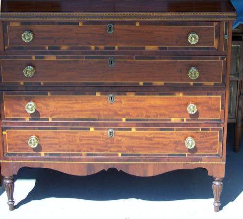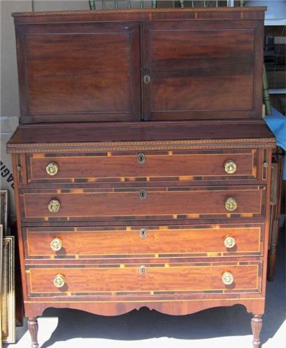 Turned, fluted legs, cross banded drawer edges, checkered inlay. Measures  39 and one half inches wide by 11 inches deep at top and 19 and one half inches deep at base and 54 and one half inches high.