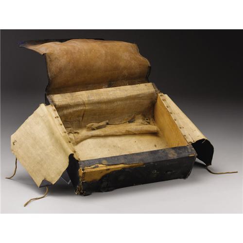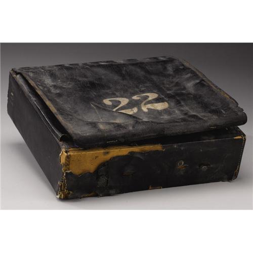 <B>Federal Box Knapsack.</B></I> 14.75” x 13.5” x 4”, wooden frame covered in a coarse tarred linen fabric, two inner flaps with tie, large blackened leather outer flap with a regimental “22” stenciled on the face. Missing straps, crazing to leather, 20% loss to fabric along the knapsack's base. Very good condition.<BR><BR><b>Shipping:</b> Miscellaneous Collectibles, Larg (<a target="_blank" href="http://www.heritageauctions.com/common/shipping.php">view shipping information</a>)