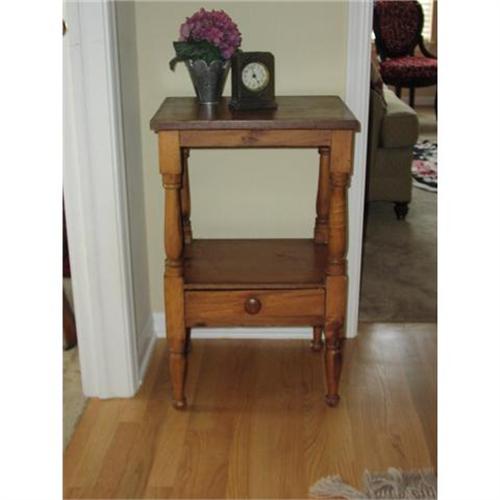 <P>This table consists of a top surface and a lower shelf under which is attached a drawer with a wooden knob. The legs are a modified vase and block ending in a bun foot. The top is a single piece of wood as is the lower shelf.