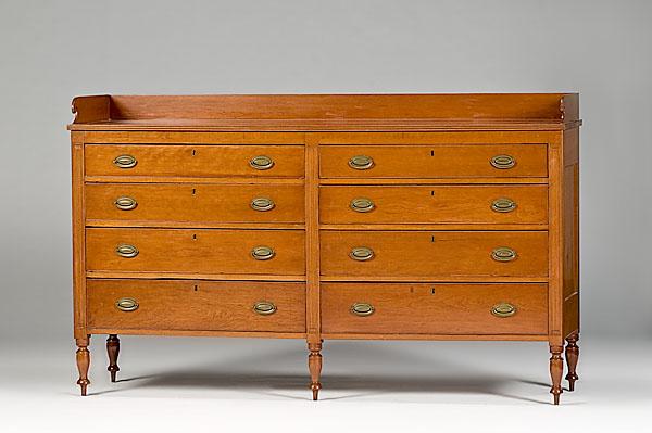 probably Indiana, ca 1815-1825, of cherry with pine and poplar secondary. A rare form with distinctive reeded edge top, and linen-fold, carved pilasters. The four pairs of adjacent scratch-beaded drawers have brass escutcheons and original brasses, the case rising on turned legs; 48" high x 79" wide x 20.5" wide.