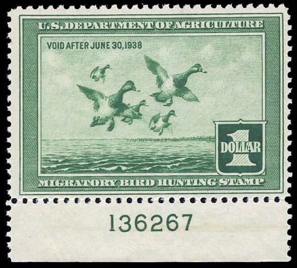 Federal Duck Stamp, 1937, $1 Scaup Ducks. Scott RW4. F-VF