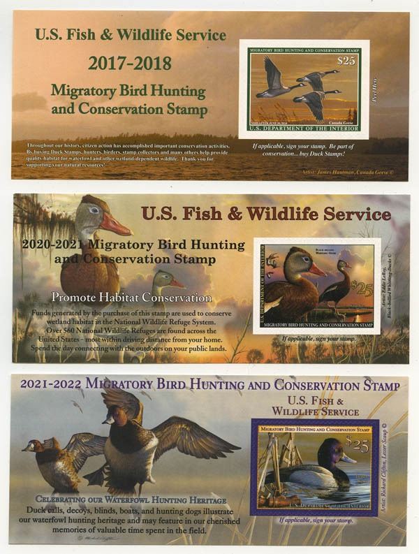 Federal Duck Stamps, 2017-24, a group of 5 souvenir sheets. Scott RW84A//RW90A. Includes RW84A, RW87A, RW88A, RW89A, and RW90A, XF