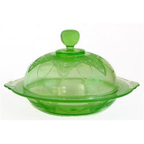 This green Depression glass butter dish was produced by the Federal Glass Co. during the years 1931-1935 in their Georgian Lovebirds pattern. Both lid and dish are in excellent condition