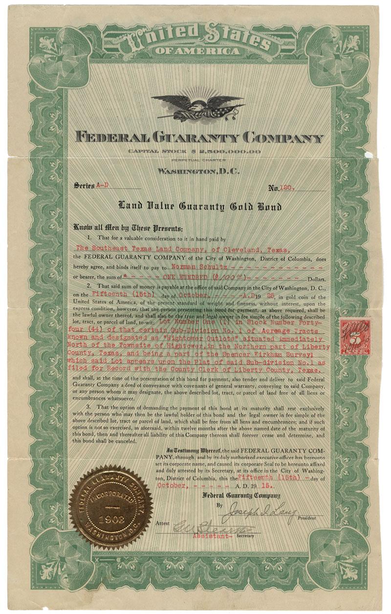 1915, Washington D.C. Bond for $100. Green. Top center vignette of an eagle perched on a flag. Raised gold seal.Revenue stamp at right border. Small fold splits Uncancelled and fine.