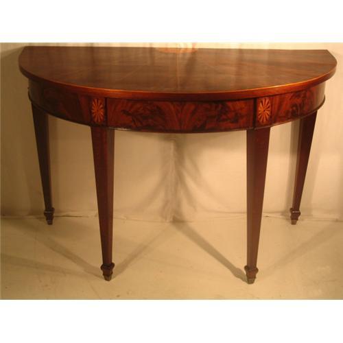 Federal Inlaid demilune console table having a top of crotch mahogany veneers with sting line inlay. Edge banded front and back with mahogany veneer. Wonderful crotch grained mahogany veneered skirt and a molded edge with a pataera oval inlay atop each of the four legs. Four tapering square legs with mahogany veneers on all sides. Ending in a stepped molded edge foot ended in a brass casing. This piece has what appears to be (heavily oxidized) yellow pine secondary wood which may place this as a mid-Atlantic (possibly Baltimore) table. When flipped over the table has five inset boards which are recessed into the pine top for stabilization as shrinkage to the pine undoubtedly caused stress to the veneered top. The from and carving to the underside of the case itself are a true statement to its age. There are veneer replacements to the front and back edges as well as some areas of the legs. We acquired it in this condition and it appears to have been professionally restored and French polished. This is a very unusual table that is certainly a feature peice in a dining room or a foyer. Could easily serve as a server or small sideboard.