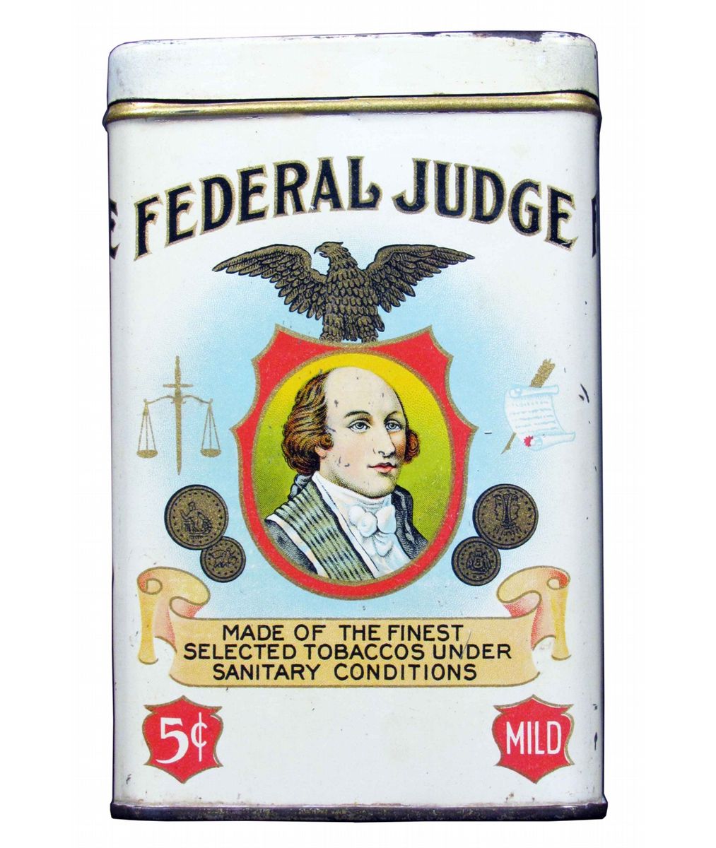 Federal Judge 25 Count Cigar Tin by the Liberty Can Co. Lancaster, PA. Very slight surface scratches otherwise excellent condition. 5 5/8 inches tall X 3 1/2 inches square.