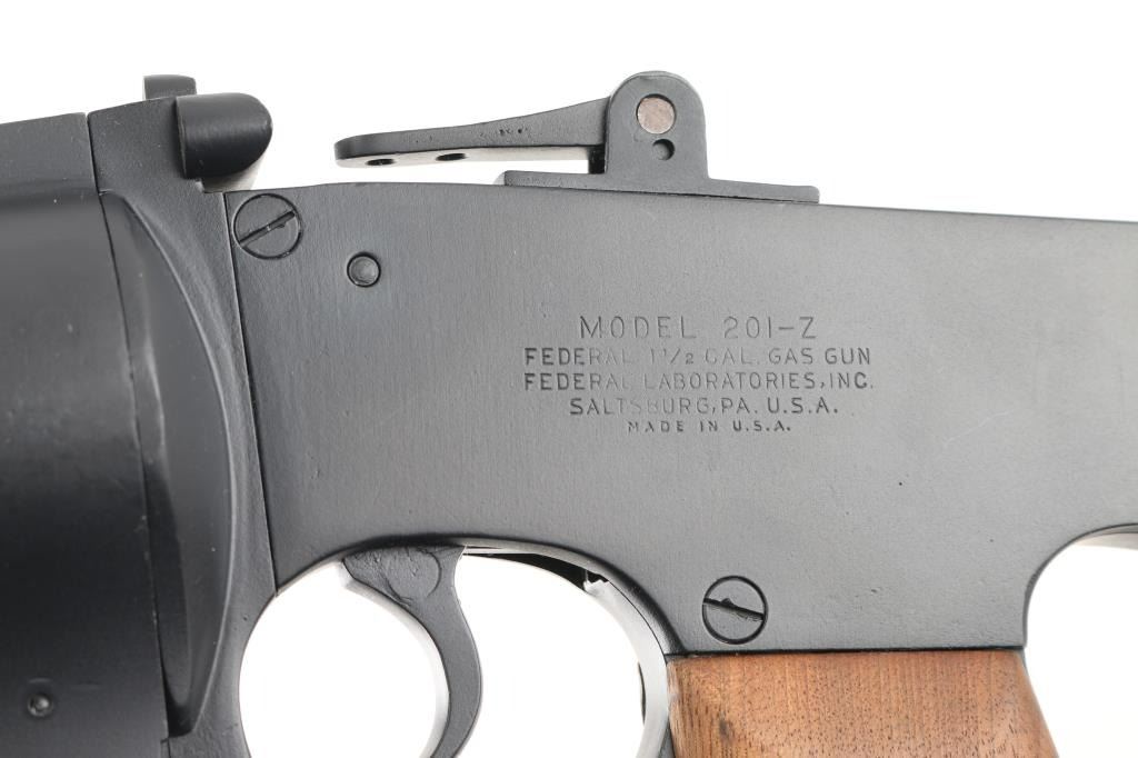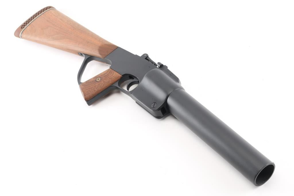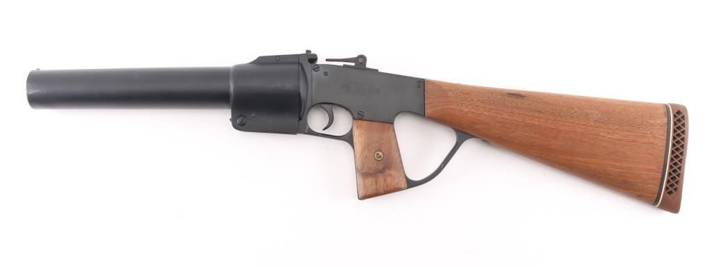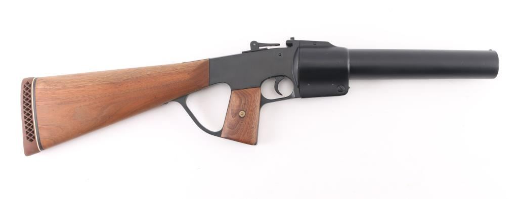 37mm flare launcher. Marked "1-1/2 CAL", Break open single shot, double action trigger, folding rear sight and brass bead front sight. Refinished in a dark gray parkerizing or matted bead-blast blue, with walnut furniture, ventilated rubber recoil pad. Bore is fairly smooth. Retains 90% refinish, some losses of markings. Marked "DOC 27059". Several hairline cracks in wood next to receiver.