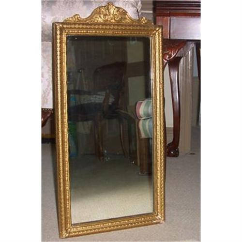 This gorgeous narrow mirror will look perfect in a powder room. It measures 15" wide x 30" high including the top onlay. It is in very good condition due to the age and has been kept clean and dry. There is one little portion of gesso/plaster missing in the bottom right hand corner. Only gives more character.
