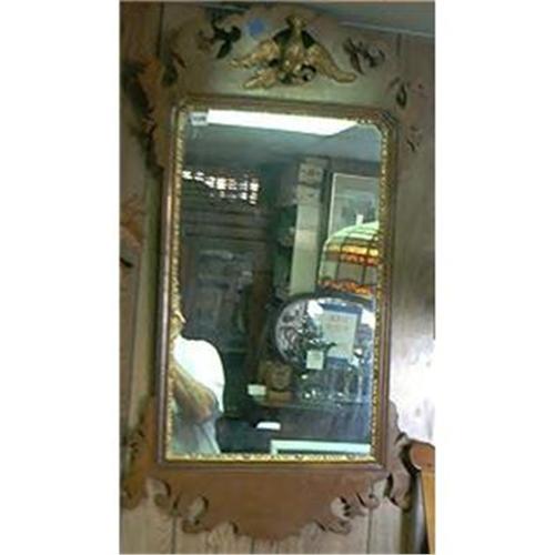 This is a real nice copy of a federal Mirror with the Phoenix Emblem on top of it. The design wood work is great & it's a beautiful mirror. It's 40" L X 21" Wide. Looks great on any wall.