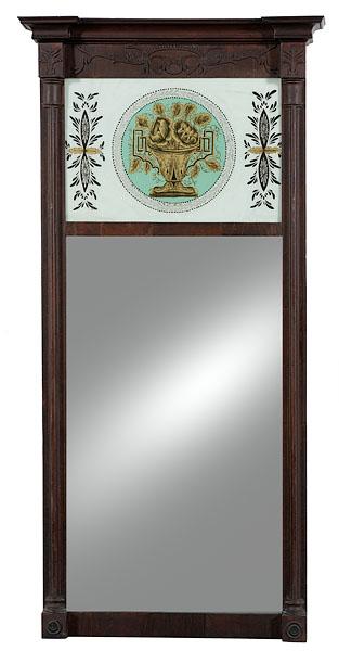 American, ca 1800-1825, in mahogany with pine secondary. The cornice with applied leaf and vine decoration, with reverse-painted panel with gilt and silvered urn and floral decoration; 42.25" high x 20.5" wide.