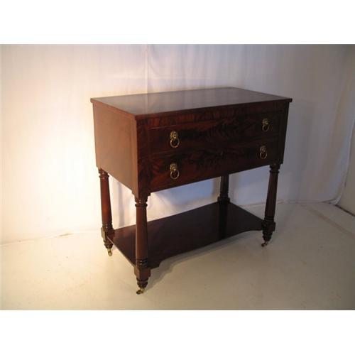 Mahogany with Mahogany veneered Federal Server having wonderfully crotch grained top above a set of two drawers with crotch grain veneered fronts and lion head pulls above a single shelf below all resting on a set of turned legs ending in original castors. Measuring only 36 1/2" wide, this is a great size and classic form of the Federal period. Likely a New York peice dating to the early 1800's. Overall measurements are 36 1/2 wide by 19 1/2 deep by 36 high.