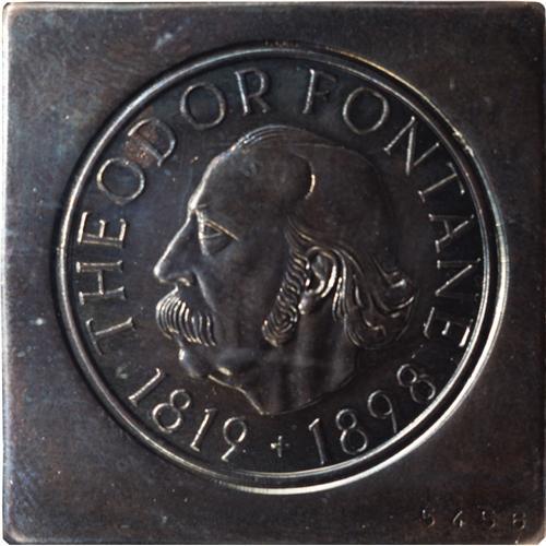 <B>Federal Republic. Fontane 5 Marks 1970G Patterns, </B></I>Obverse and reverse uniface klippe (36x36mm) trial strikes in what appears to be pewter, both MS63 NGC (in oversize holders), J-399 variety. This is one of the runner up designs and is decidedly rare.
