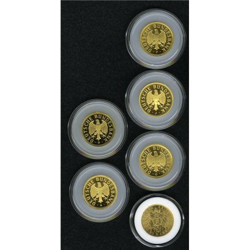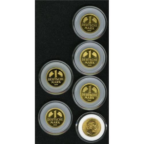 <B>Federal Republic, One Mark Proof Gold Set 2001,</B></I> KM203, including one coin each minted in Berlin (A), Munich (D), Karlsruhe (G), Hamburg (J) and Stuttgart (F), all are Gem Proof. Also included is an About Uncirculated Prussian 20 Mark 1901-A gold coin (KM521). Housed in a custom case.