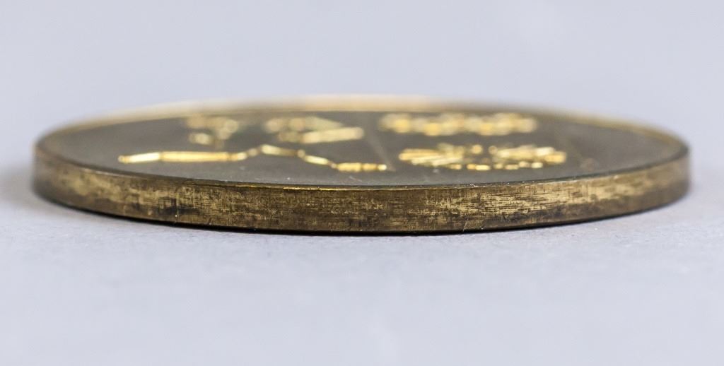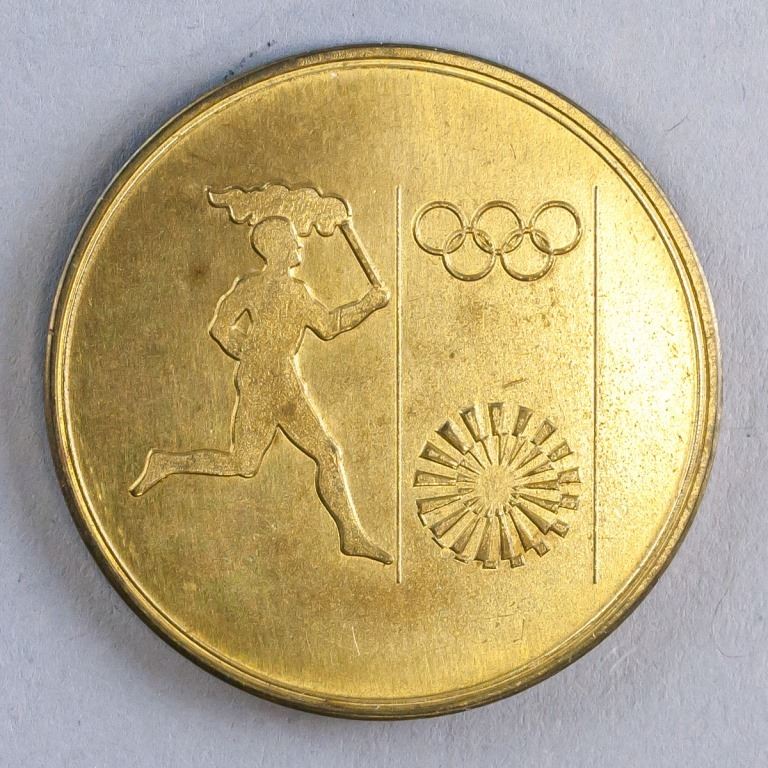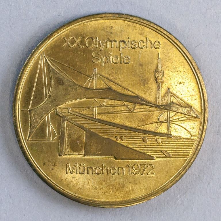 German coin. Obverse: picture of Olympic stadium. Letter: XX.OLYMPISCHE / MUNCHEN 1972. Reverse: figure holding Olympic torch, Olympic rings, and sun burst. Diameter: 4 cm, 23 grams.