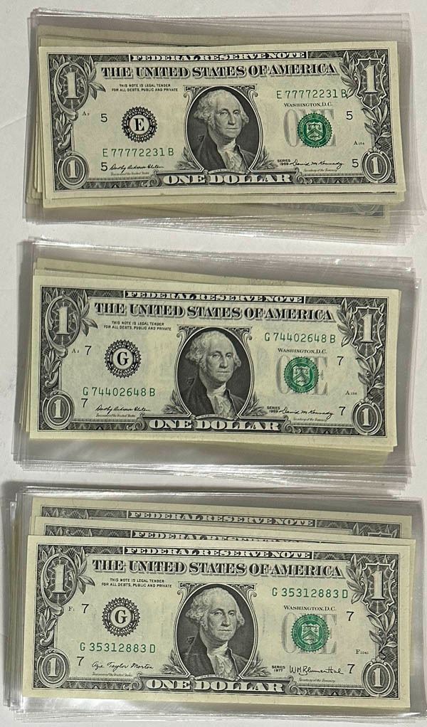 Federal Reserve $1 Notes, 1969 and 1977 Series, with consecutive serial numbers. Includes serial #35312831-35312883 plus 3531283 - an impressive run of over 50 consecutive serial numbers; plus another run of mostly consecutive numbers from 74402648-74402700 (not complete); plus some with consecutive numbers within a serial number such as 7772231...plus five $2 bills red seal with consecutive numbers...this is a neat lot with $100 in face alone!