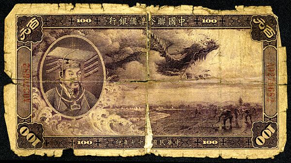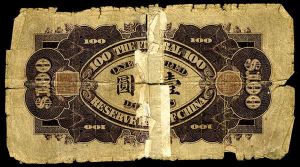 China, $100, P-J58a, Issued banknote, Purple, Portrait of Huang Ti on left, dragon in middle, VG with considerable repairs and damage including vertical repaired split and edge faults, Rare note in any condition.