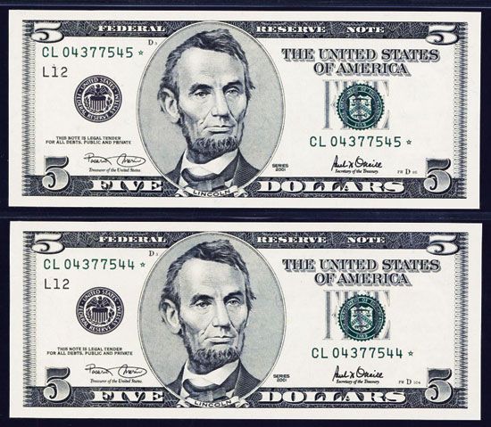 Sequential Pair of Banknotes, U.S., Series 2001, $5, Fr#1988-L* Issued Star Note, FW printing, Marin | O'Neil, S/N CL 04377544* and É.45*, Both PMG graded Superb Gem Uncirculated 68 EPQ. pp D.
