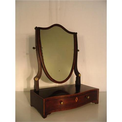 Federal period sheild shaped dressing (shaving)mirror resting on a serpentine base. Constructed of Mahogany with birch inlaid trim to the top side and a birch escutcheon. Measuring 15" wide by 7 1/2" deep by 20 1/2" high. Appears to be in untouched original condition. Very stylish. c.1815 Your complete satisfaction is our goal. If you are not happy with an item purchased, return it in it's original condition for a refund.
