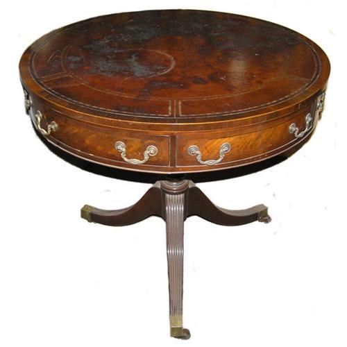 This vintage mahogany drum table in English Regency or American Federal style is believed to date from the 1930s or 1940s. Sold by Hathaway's of 51 West 45th Street in New York city. Measures roughtly 36" in diameter and 30" high. Features a revolving top and two drawers on opposite sides. Original leather top is quite worn and crackled, but lends great character to the piece. We do not recommend its replacement but it could benefit from the application of a leather balm. This item resides on the upper west side of Manhattan ( New York city ) and may be seen by appointment.