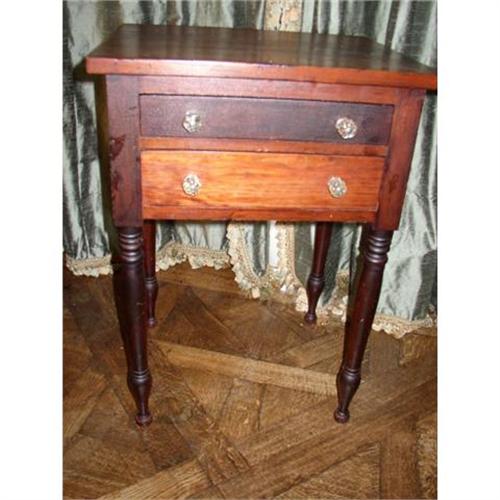 <table width="100%" border="0" cellspacing="0" cellpadding="4"><tr><td><em> This piece of American history will work well in many settings from American primative to formal French.</em></td></tr><tr> <td width="100%"> This Federal Light Stand is mid-19th century or earlier. Hand-cut dovetails, chamfered drawer bottoms and appropriate aging on unprotectected lower drawer bottom compared to more protected upper drawer bottom. The finish on the case appears to be an old re-finish or possibly an alcohol rub of an earlier French Polish. The turned legs appear to be original finish or at least older than the case finish. The differing finishes do not detract. In fact, they make the piece visually more striking than otherwise would be. The patina is goodwith enough old wear to give desireable character. The glass pulls show age but are not original, unless attachment hardware has been replaced with newer plated screws and nuts. The table contains a handwritten note: "according to my mother this table is about 100 yrs. old-". The note is not dated, but the table is certainly about two and a half times that age, today. This is an eye-catching table of a very useful size. Would work well in many different settings. </td></tr><tr> <td> </td></tr><tr> <td>Reference #: A2926RCW</td></tr><tr><td>Condition:Good</td></tr><tr><td>Year:c.1850</td></tr><tr><td>Country:American</td></tr><tr><td>Height:29</td></tr><tr><td>Depth:17.75</td></tr><tr><td>Width:20.5</td></tr><tr><td>Weight:27</td></tr><tr><td>Title:Federal Two-Drawer Light Stand</td></tr><tr><td>Style:Federal</td></tr><tr><td>Materials:Walnut</td></tr><tr><td>Location:Dallas, Texas</td></tr></table>