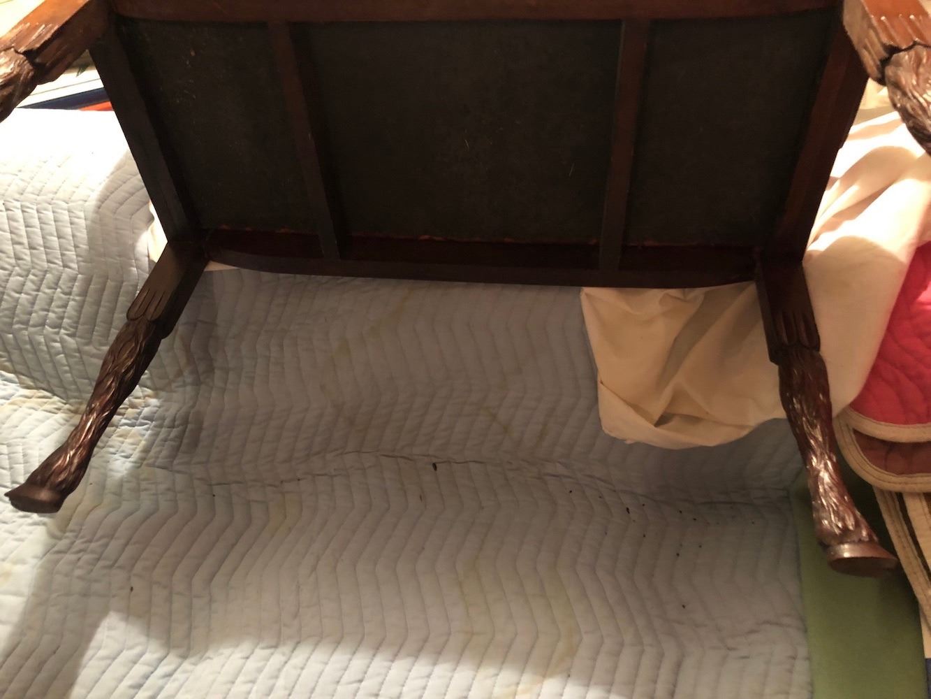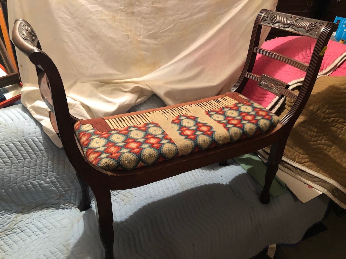 Federal Window Bench, cornicopia carvings on sides, needlepoint seat, carved fur and hoof legs. Beautiful, rare window bench.