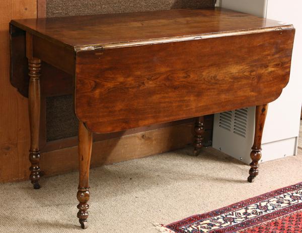 Federal walnut drop leaf table circa 1820, the rectangular form flanked with two scalloped drops and rising on turned and tapered legs terminating on later casters, 28.5''h x 42''w x 20''d (closed)