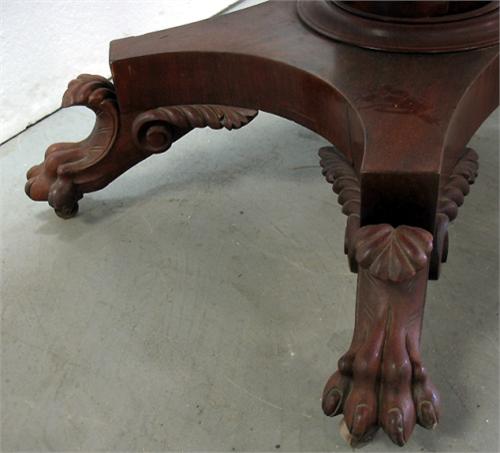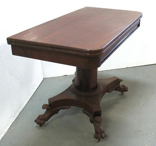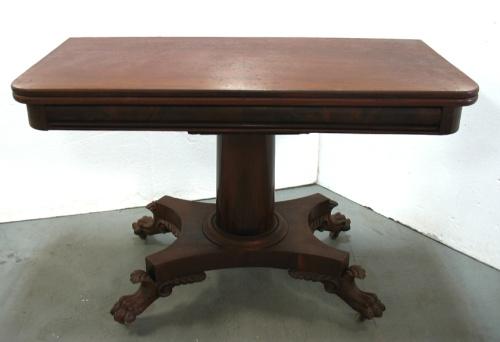Federal mahogany game table; rectangular hinged top; round pedestal on formed base with acanthus carvings terminating in four paw feet on casters; early 1800's; 30" high x 45" x 22" (no visible defects)