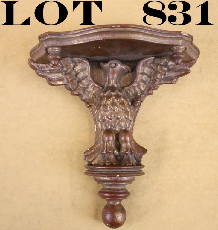 Federal period wood wall sconce approx. 11” in height with an approx. 11” platform in overall good condition for its age with some scattered nicks and mars but complete; spread wing eagle incorporated in the center of the sconce with traces of gold coloring remaining along with traces of reddish base coloring. Est.: $150-$300.