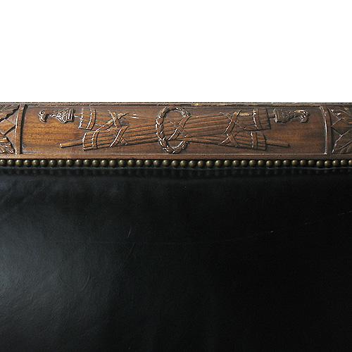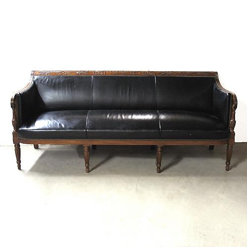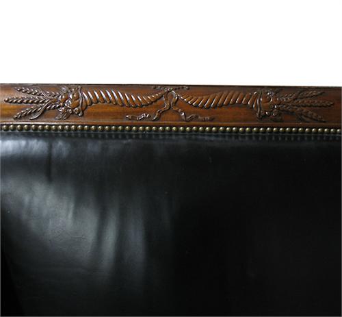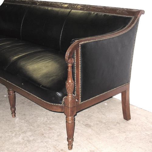 Federal style mahogany and black leather upholstered sofa; cornucopia and ribbon carving on crest rail; reeded carving on armrails; vase and block supports under hand rests; four round fluted front legs ending in peg feet; early 20th C.; 35" high x 89" across x 33" deep (no visible defects)