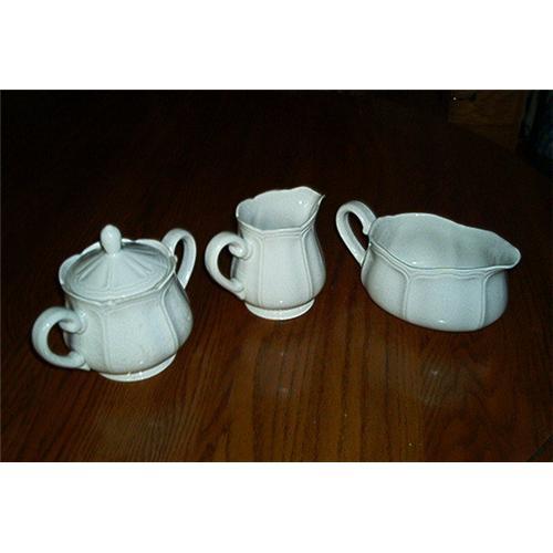 </font></strong>Displaying a sugar, creamer and gravy boat called Federalist Ironstone. Stamped on the bottom of each piece , (in green), FEDERALIST IRONSTONE-MADE IN JAPAN-#4233-Dishwasher Safe. The sugar bowl measures 3 3/4 inches tall; opening diameter measures 3 3/4 inches; depth measures 3 inches; base diameter measures 2 3/4 inches; The gravy boat measures 3 inches tall; opening measures 5 1/2 inches long by 4 inches wide; depth measures 2 1/2 inches; Bottom base measures 3 1/2 inches long x 2 1/4 inches wide. The creamer measures 4 inches tall; opening diameter measures 2 7/8 inches; depth measures 3 1/2 inches; One tiny niplet on the top edge of the covered sugar bowl. Otherwise in excellent condition.</font>