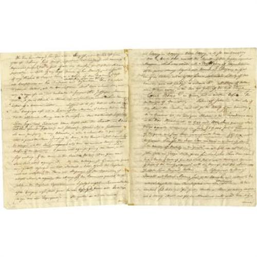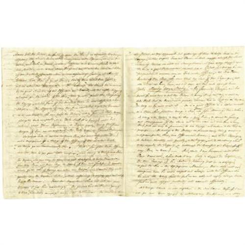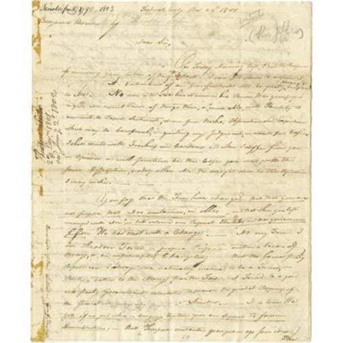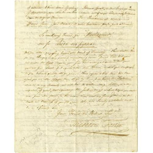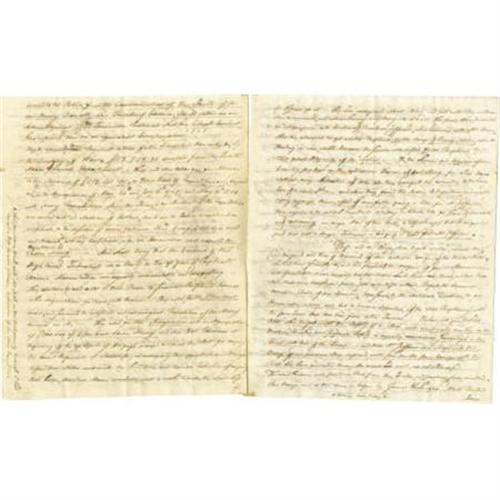 <B>Theodore Foster Autograph Letter Signed </B></I>"<I>Theodore Foster</B></I>", 8 pages, 8" x 10", "<I>Federal City</B></I>" Washington , December 22, 1801 to his former Senatorial colleague from Rhode Island Benjamin Bourne. Theodore Foster, (1752-1828), together with Bourne, was one of the first two Senators to represent Rhode Island after 1790 when it ratified the federal Constitution. Both men were staunch Federalists but following the acrimony of the late 1790s, the disillusioned Foster defected to Jefferson and the Democratic-Republicans. Foster writes to his former colleague accusing the Federalists of base corruption, attempting to plunge the nation into civil war over the additional army issue, and interfering in the election of 1800. Foster's incendiary letter reads, in part: "<I>...It is true we both of us, did when in Congress together give our support to former administrations. -- But (Tempora mutantur quanquam ego sum idem) The times have changed since you was in Congress, and in the two last years of the last presidency such unwise, imprudent, extravagant and ruinous measures were proposed, that in spite of all my friendships, for President Adams, personally;_ in spite of my high opinion of his honesty...I lost all confidence in his prudence and direction notwithstanding it was once great. -- Was I to relate to you, in detail, all the circumstances which have induced me, not only to acquiesce in, but cordially to support Mr. Jefferson's administration, so far as I think his Politicks wise and prudent it would make a volume instead of a common letter. -- Suffice it to say that in March 1799 when congress rose not a quarter of the members, I believe, had an idea that the additional Army was to be raised. None but the most hightoned of the hightoned federalists were trusted with the secret -- I knew nothing of it. But had been apprised positively and solemnly assured, by a gentleman who came purposely to my chamber, in order to induce me to give my vote to grant power of raising the Army, to the executive, that it should not be brought into the field, unless there was eminent </B></I> <I>sic</B></I> <I> danger of an Invasion of the country. I however voted against giving power, on the first reading of the bill in the senate. The only man from our state that voted against it. -- My fine colleague, Mr. Green, was greatly, very greatly distressed on that account. I was afraid the President could not withstand the force and urgency of the application of interested men, to organize the Army, if the power was granted, to rest solely in the Presidents discretion. -- I judged right. -- For immediately after congress rose, that year he was besieged, from all quarters, (to use his own expression) -- He yielded and was ruin -- and happy -- happy-thrice happy is it for our country that a civil war was not the result of that highly imprudent measure-which was attended with a profligacy of expenditure of the public money beyond all bounds of Reason, as if it was of no value; -- and as of the future Labour and Liberty of this country was not pledged to redeem it. Millions of dollars were thrown away, in the two last years of the last presidency-... Men who if they shared the plunder, cared not for the interest of or country. As a specimen let me turn attention to the expenditures only in the War Department in 1799 and 1800, where among other things equally astonishing we find $59,000 paid to General Lee of Virginia and some others concerned with him - $17,000 went to General Lee, 'for the iron ore contained in a tract of Land in the country of Berkeley in Virginia' - and $42,000 to Wm. Wilson, John Potts and George North, for the said land, when I have been assured by a member of Congress from that State, that it was the Universal opinion of the people Vicinity, acquainted with the business, that the whole was not worth five thousand dollars -- The disbursements to Henry Foxall and Robert Morris Jr, for the barracks and Laboratory etc on the Schuykill near Philadelphia were also extravagantly injudicious. ...</B></I>" Foster then comments upon the election of 1800 and the intrigues in the Senate during the balloting for President accusing high Federalists of "<I>preventing the Acquiescence in the Election of President Jefferson, when returned with Mr. Burr, whom they attempted to get elected President, by the House of Representatives, notwithstanding it was well known the former was wished for President by a very great Majority of the Nation. -- to the shame and disgrace of our Country, they kept up the ridiculous Farce of Balloting for Six Days without any attention of Votes, till they brought the country to the very Eve of a civil War. -- and when they found the Public Indignation universally rising against them, instead of manfully giving a vote for Mr. Jefferson, they resorted to the pitiful Expedient t putting in Blank Votes for some of the States and allowing one single Man of their Party, to absent himself that it might be said that not a single Federalist in Congress Voted for Mr. Jefferson...</B></I>" Foster concludes, "<I>...These and other things, which I could mention, induced me, (and thousands and ten of thousands of other moderate citizens of the United States (*witness new Jersey etc) who had been friendly to, and had supported the measures of former administrations on the ground that it was necessary that the nation should have a head, and that then their views were honest ad pure,) not only to see without regret, the Supreme executive power of our country transferred, by the national election, to an administration entirely new, but to become supporters of the new presidency with the Same Zeal that had been given to the former... </B></I>" This piece contains more fine content, far too voluminous to transcribe here. Glue remnants at left margin on first page, usual folds, else near fine condition. This is remarkable content from the very beginning our national history. <I>