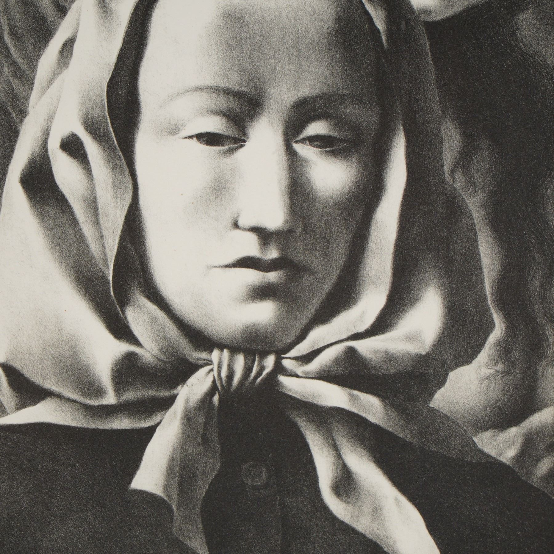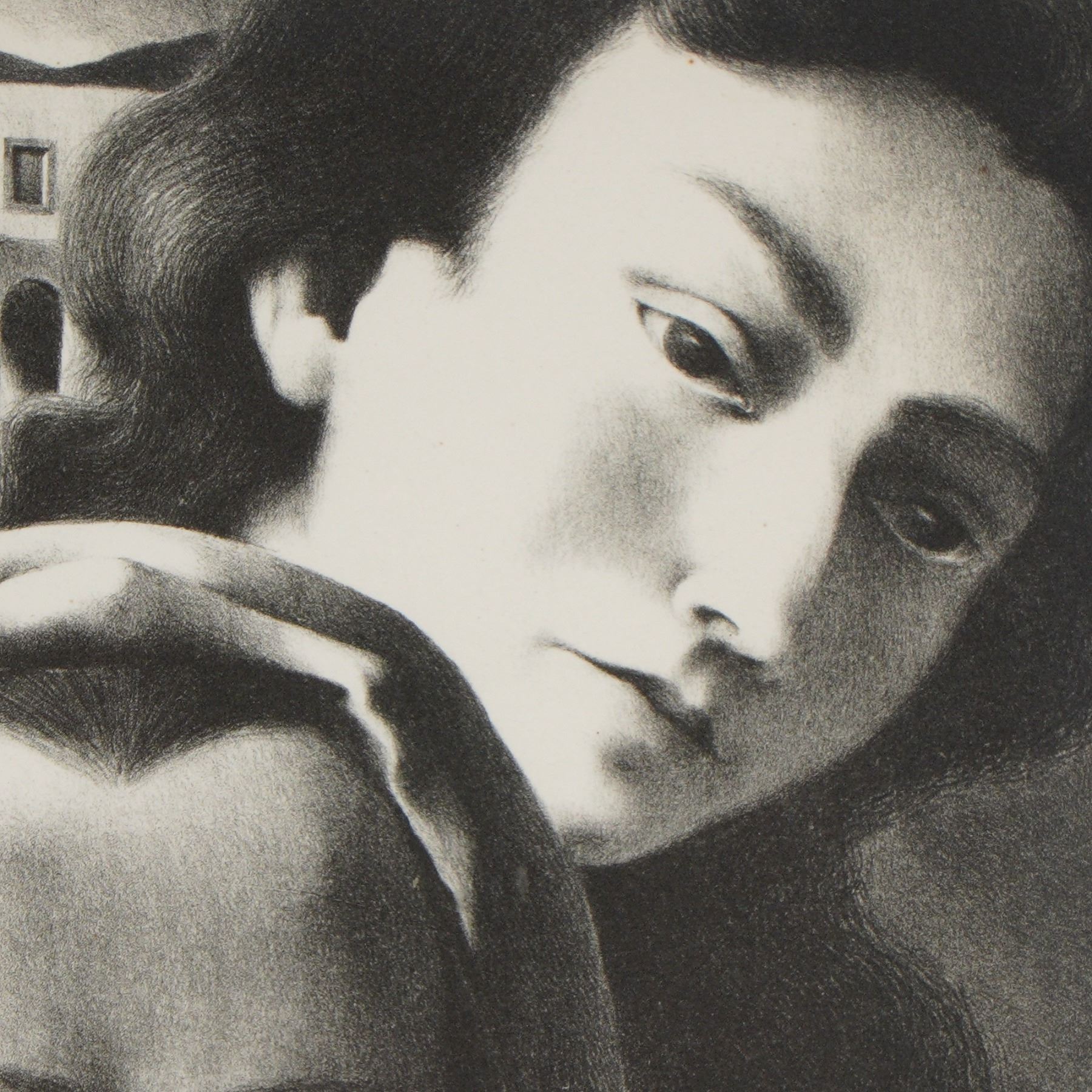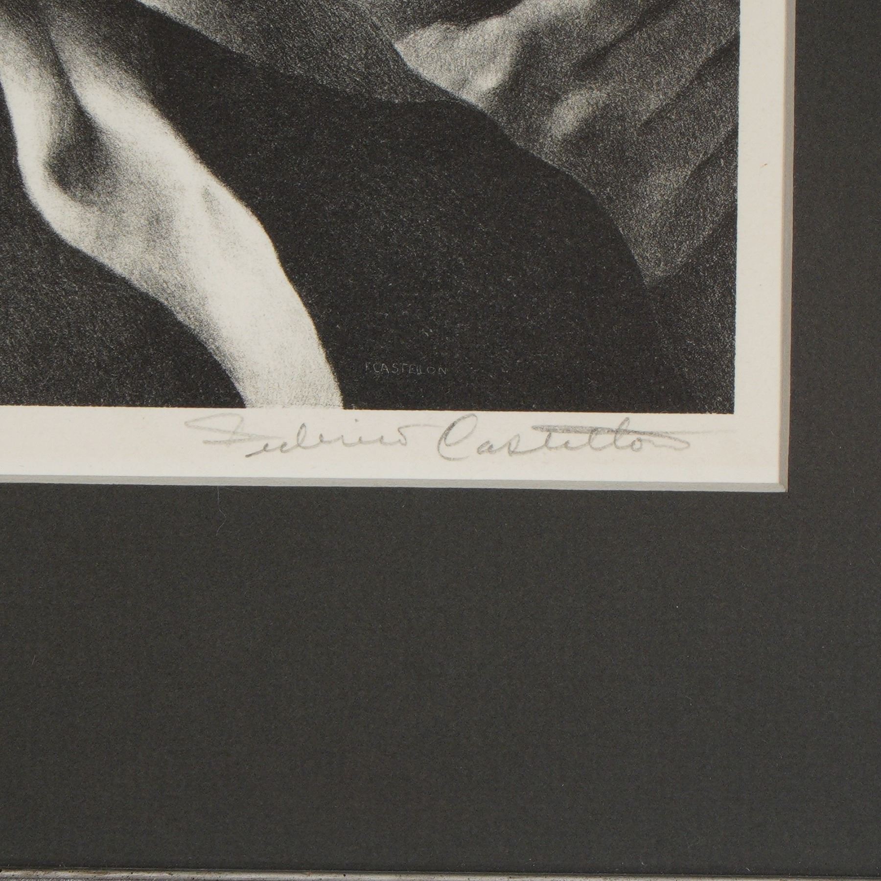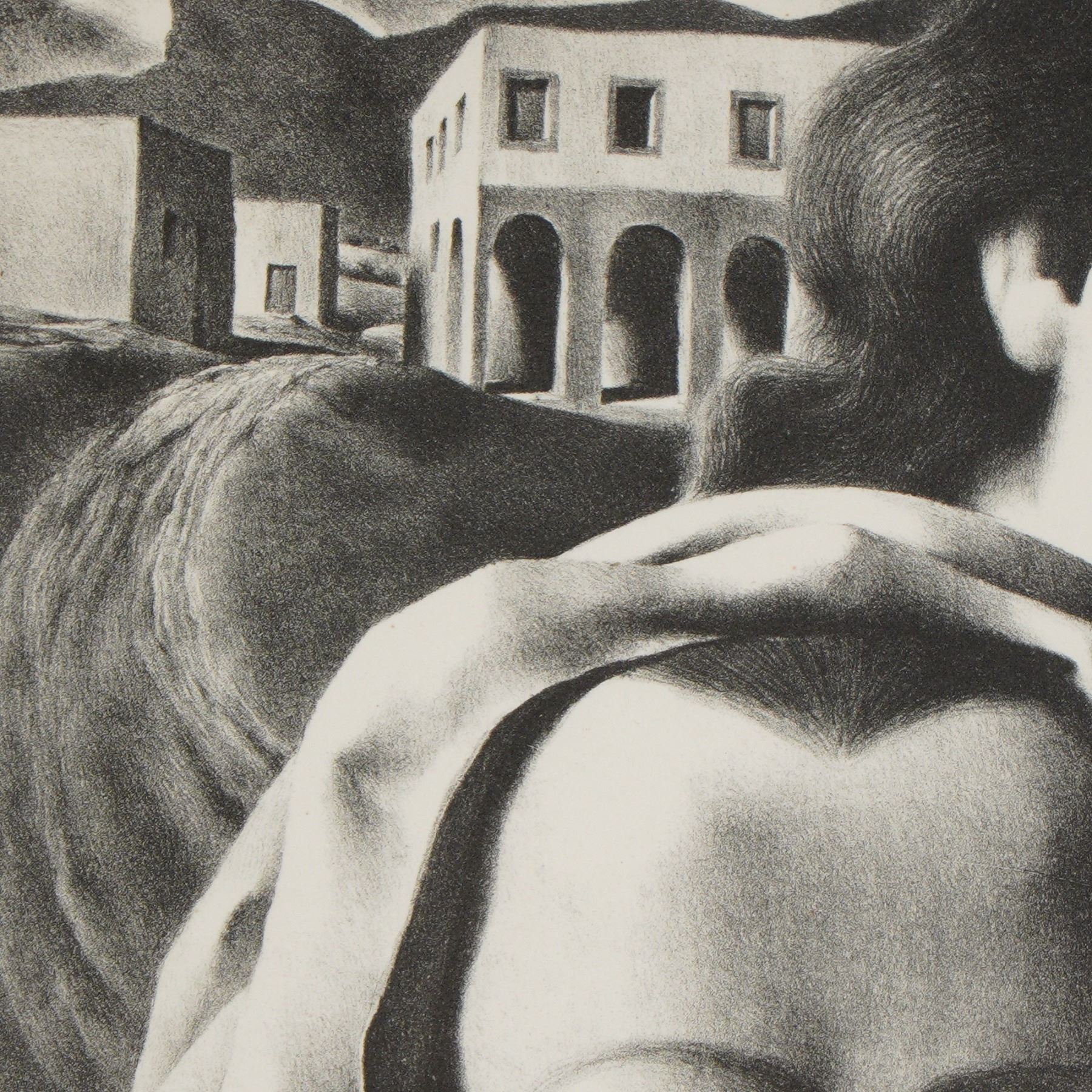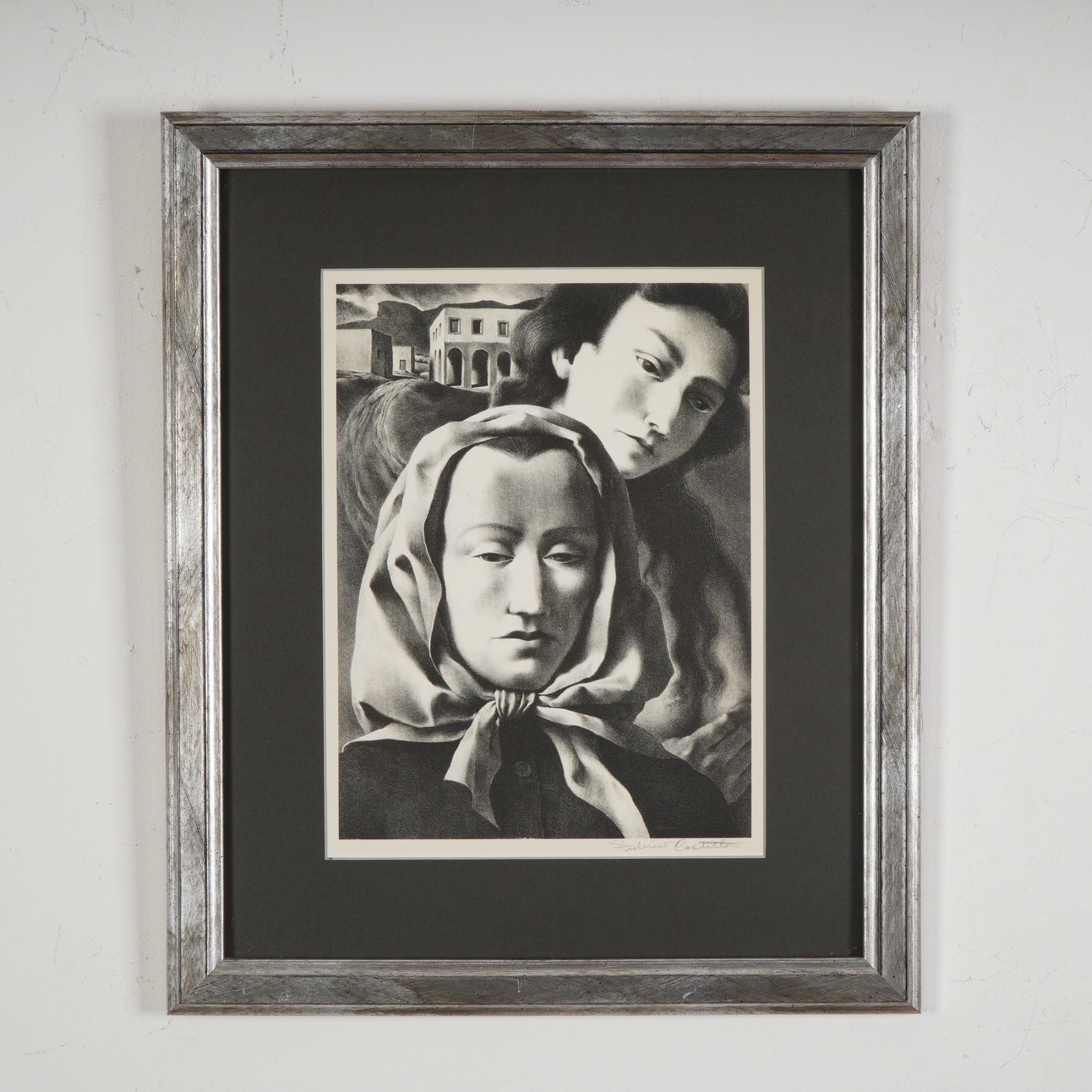 Striking lithograph on paper by acclaimed Spanish-American artist Federico Castellon. This evocative black-and-white composition features two women rendered with Castellon's signature mastery of light, shadow, and surreal realism, set against an architectural backdrop. Castellon was celebrated for his contributions to the American art scene, particularly within the realms of surrealism and social realism, producing paintings, lithographs, and illustrations that often explored human emotion and psychological depth. His works are held in major museum collections, including the Smithsonian American Art Museum and the Metropolitan Museum of Art. This framed and matted piece, exemplifies Castellon's ability to merge technical precision with haunting narrative power, making it a standout addition to any fine art collection. Signed in graphite on lower right.