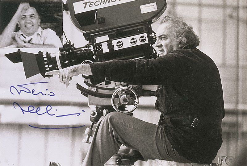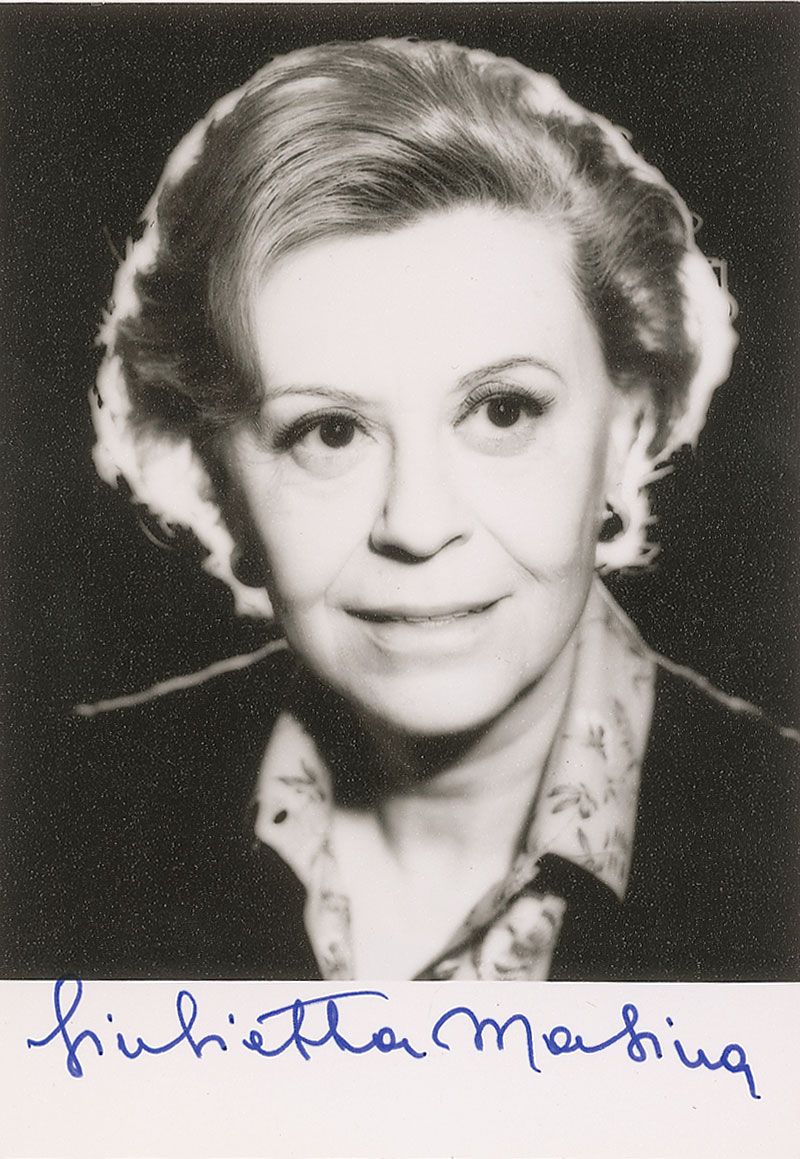 Glossy 7 x 4.75 photo of Fellini directing from behind a camera, signed on the left side in blue ink; and a satin-finish 4 x 5.75 photo of Masina, signed in the lower border in blue ink. In overall fine condition.