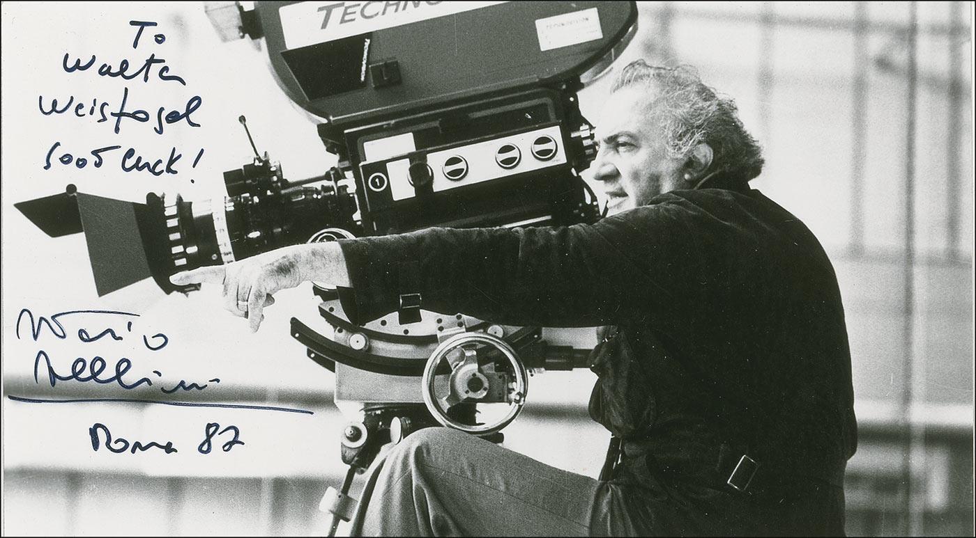 Glossy 7 x 4 photo of Fellini behind the camera, signed and inscribed in black felt tip “To Walter Weisfogel, Federico Fellini Roma 82.” In fine condition.