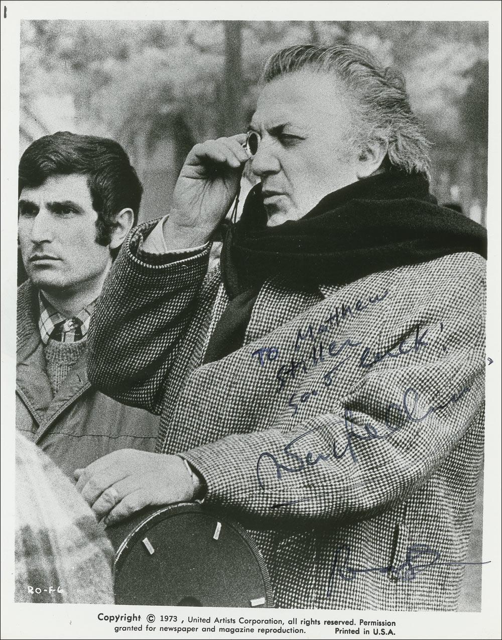 Glossy 8 x 10 United Artists promotional photo of Fellini on the set, signed and inscribed in black felt tip “To Matthew Stiller, Good luck, Federico Fellini, Roma 82.” Scattered light creases and surface marks, some light contrast to signature and inscription, and Fellini switching to black felt tip after first word of inscription, otherwise fine condition.
