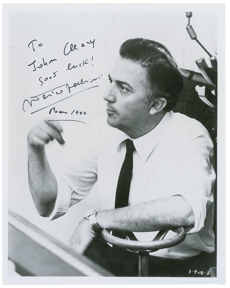 Two items: glossy 8 x 10 photo of Fellini, signed and inscribed in black felt tip “To John Cleary, good luck! Federico Fellini, Roma 1990”; and a paperstock 6 x 3.75 photo of Fellini behind the camera, signed and inscribed in black felt tip “John Cleary, Federico Fellini, Roma 90.” In overall fine condition. Accompanied by the second item’s original mailing envelope.