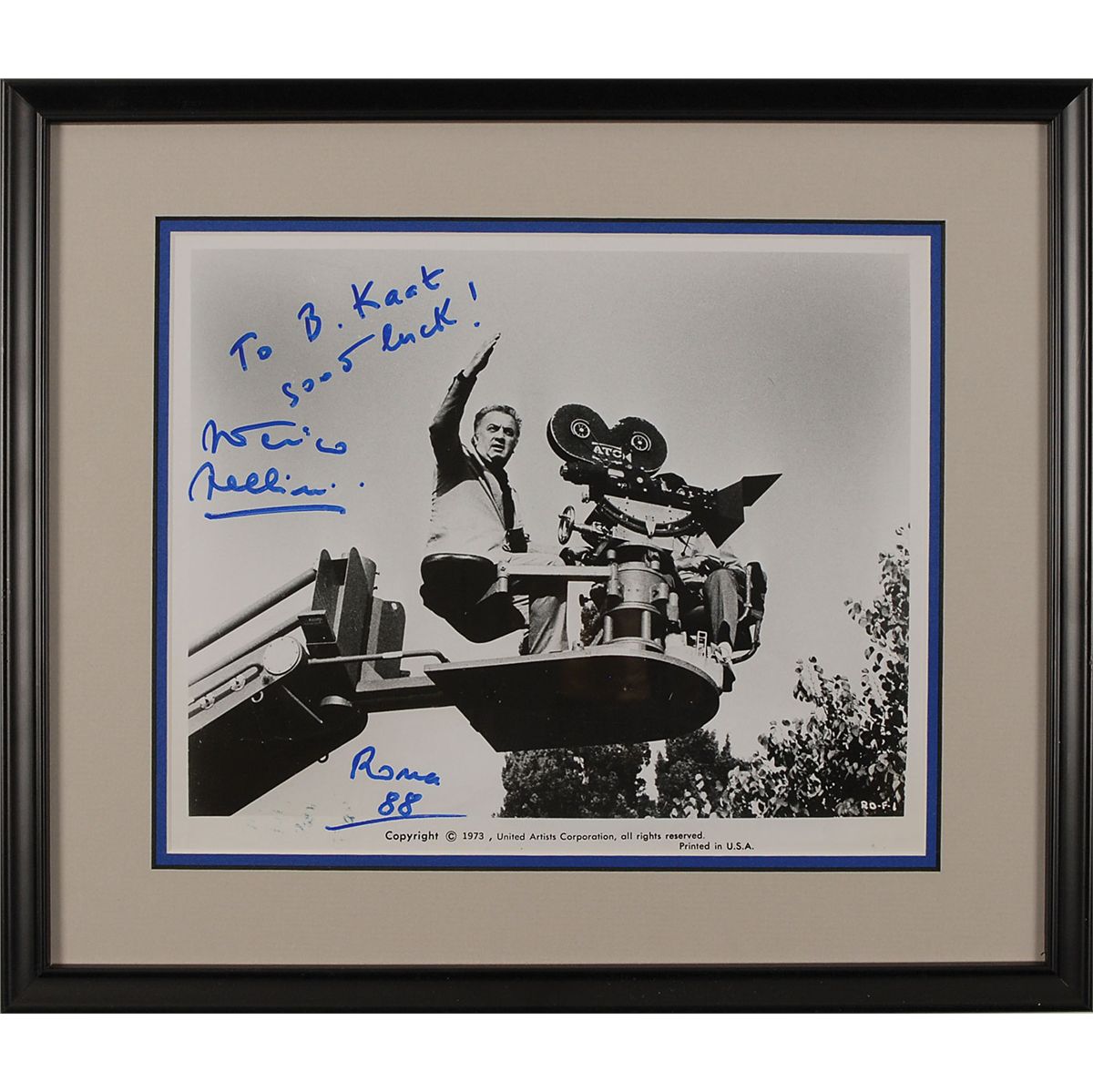Glossy 10 x 8 United Artists publicity photo from 1973, signed and inscribed in blue felt tip, “To B. Kaat, good luck! Federico Fellini, Roma 88.” In very good condition, with scattered noticeable creases, a few impressions, and some stray ink marks next