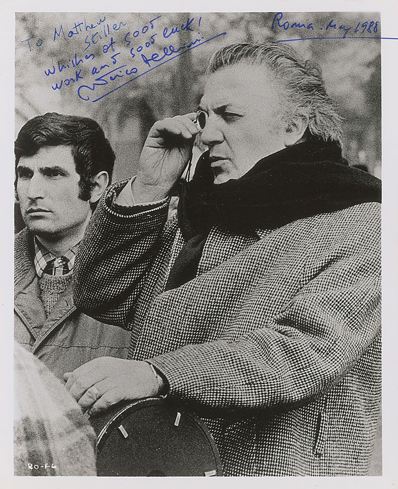Glossy 8 x 10 photo of Fellini peering through an eyepiece on a wintery day, signed in blue felt tip, “Whishes [sic] of good work and good luck! Federico Fellini, Roma, May 1988,” and inscribed in another hand, “To Matthew Stiller.” In fine condition, with a few dings to top edge.