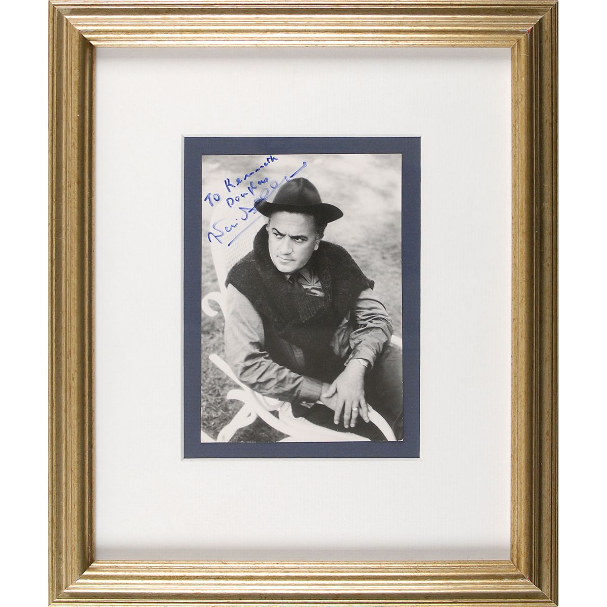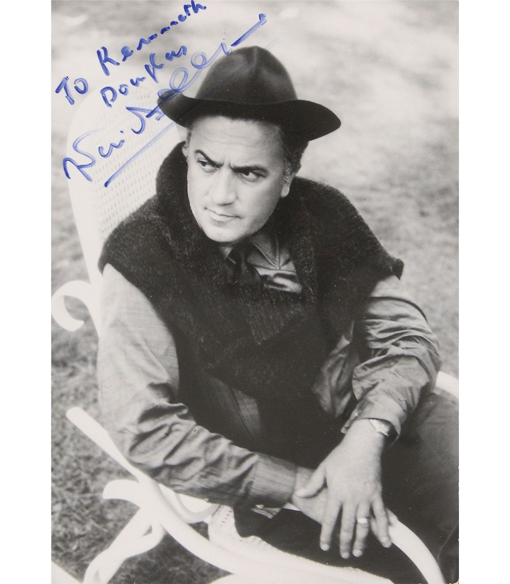 Glossy 4 x 5.75 photo of the director wearing a hat, signed and inscribed in black felt tip, “To Kenneth Douglas, Federico Fellini.” Double-matted and framed to an overall size of 10.5 x 12.5. In fine condition.