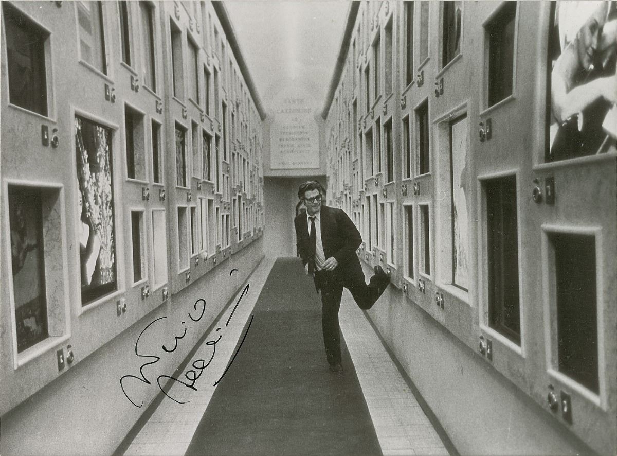Amusing satin-finish 9.5 x 7 full-length photo of Fellini playfully kicking a switch in a hallway gallery, signed in black ink. In fine condition.