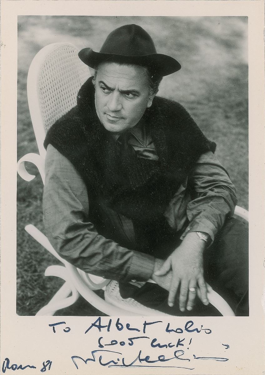 Semi–glossy 4 x 5.75 photo of Fellini in a seated pose, signed and inscribed in black ink, “To Albert…good luck! Federico Fellini, Roma 81.” In fine condition.