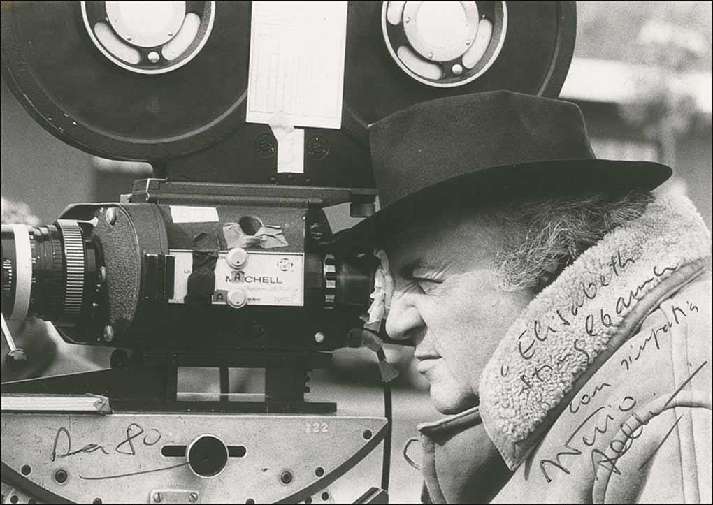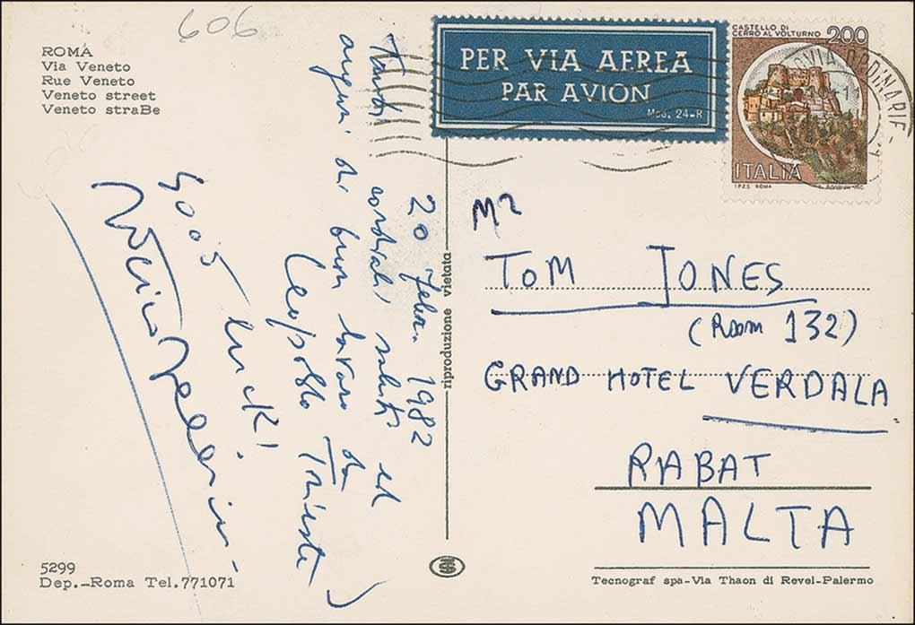 Two items: Matte-finish 6 x 4 photo of Fellini looking through his camera lens, signed and inscribed in Italian, and dated 1980; and a short ALS, in Italian, on a 6 x 4 postcard, dated February 20, 1982, written to Tom Jones. Postcard is affixed to a slightly larger brown sheet. In fine condition.