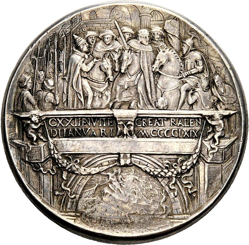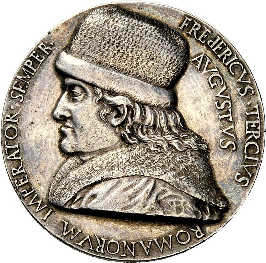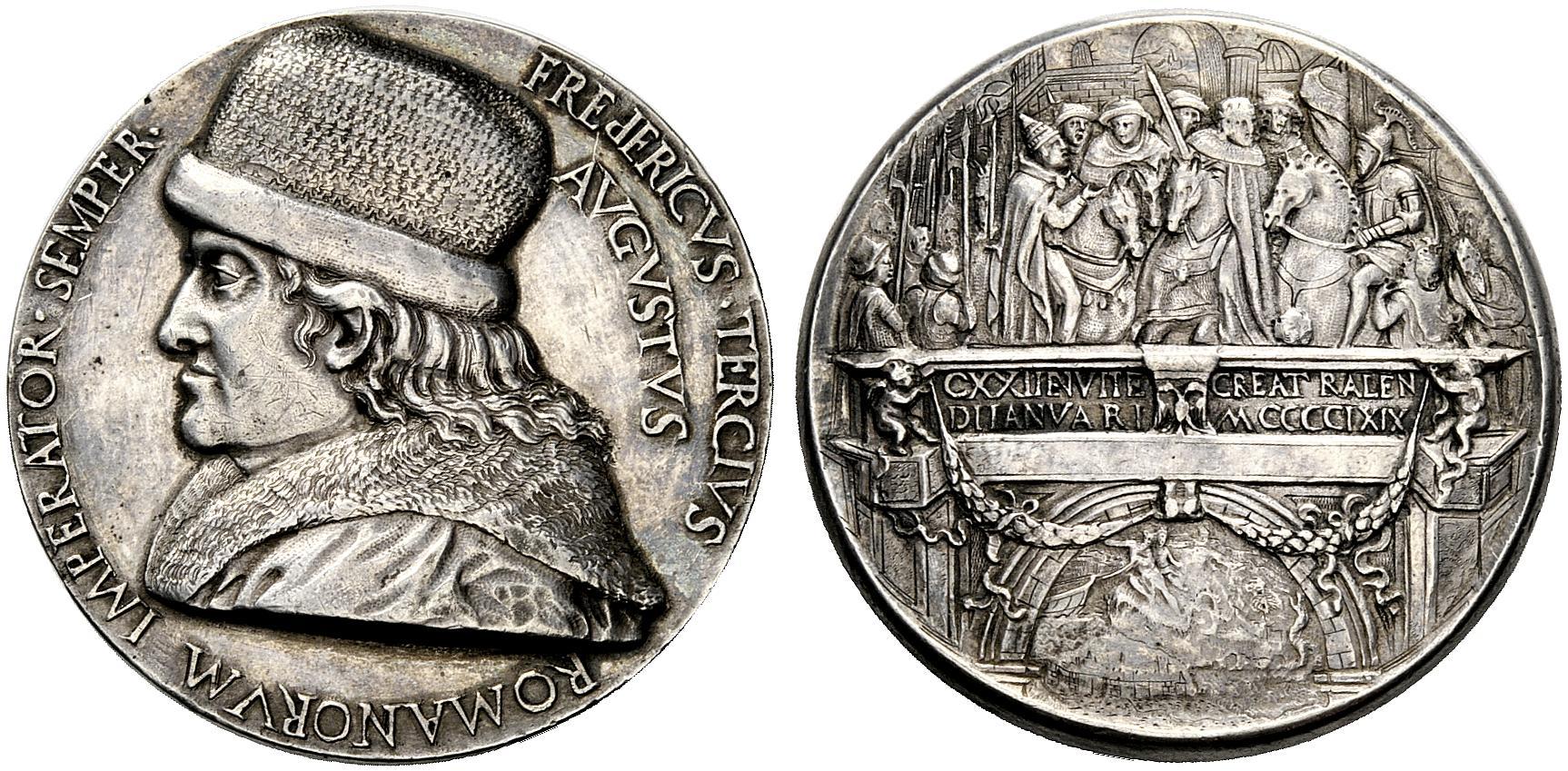 Medaglie e placchette. Federico III d’Absburgo, imperatore del Sacro Romano Impero, 1452-1493. Medaglia 1469. per la distribuzione delle patenti nobiliari a Roma (opus: Bertoldo di Giovanni), fusione in argento 65,29g. Ø 57 mm. FREDIRICVS TERCIVS ROMANORVM IMPERATOR SEMPER AVGVSTVS Busto a s., con berretto e mantello. Rv. Federico, con la spada sguainata, stante a cavallo sul ponte di S. Angelo alla presenza del Papa, anch’egli a cavallo, di Cardinali e numerosi armigeri, ordina nuovi cavalieri. Ai lati del ponte, due putti sostengono ghirlande e festoni. Sull’architrave del ponte: CXXII EQVITE-CREAT RALEN / DI (sic!) IANVARI-MCCCCLXIX. Hill 912 (bronzo). Kress 249 (bronzo). Vannel Toderi Bargello 299-302 (bronzo). Della più grande rarità, apparentemente unica. Spl / q. Spl Ex asta Cahn ottobre 1908, 2. ’imperatore Federico III giunse a Roma la notte di Natale del 1468 per prendere accordi col Papa. Il primo gennaio 1469 assisté alla messa in San Giovanni in Laterano, poi si recò in Vaticano fermandosi per circa un’ora su ponte S. Angelo dove distribuì patenti di nobiltà. “Il 9 gennaio 1469, di buon mattino, l’imperatore partì da Roma senza pompe. Aveva dispensato a larghe mani diplomi di onorificenze, e durante il viaggio verso casa sua, continuò a distribuirne con molto lucro”. (Gregorovius). Bertoldo di Giovanni-nacque intorno al 1420 e nel 1455 entrò nella bottega di Donatello, dove rimase fino al 1466, anno della morte del maestro, di cui fu erede e continuatore dell’opera. Entrò a far parte della cerchia di artisti legati ai Medici, e fu il maestro di Michelangelo. Si spense nel 1491. Scrive il Vasari: “ Teneva in quel tempo il magnifico Lorenzo de’ Medici, nel suo giardino in piazza San Marco Bertoldo scultore, non tanto per custode o guardiano di molte belle anticaglie che in quello aveva ragunate e raccolte con grande spesa, quanto perché, desiderando egli sommamente di creare una scuola di pittori e di scultori eccellenti, voleva che egli avessero per guida e per capo il sopraddetto Bertoldo che era discepolo di Donato; ed ancorché è fusse sì vecchio che non potesse più operare, era niente di manco maestro molto pratico e molto reputato, non solo per avere diligentissimamente rinettato il getto de pergami di Donato suo maestro, ma per molti getti ancora che egli aveva fatti di bronzo di battaglie e di alcune altre cose piccole, nel magisterio delle quali non si trovava allora in Firenze chi lo avanzasse. Dolendosi dunque Lorenzo, che amor grandissimo portava alla pittura ed alla scultura, che nei suoi tempi non si trovassero scultori celebrati e nobili, come si trovavano molti pittori di grandissimo pregio e fama. deliberò, come io dissi, di fare una scuola; e per questo chiese a Domenico Ghirlandai, che , se in bottega sua avesse de’ suoi giovani che inclinati fussero a ciò, gl’inviasse al giardino dove egli desiderava di esercitargli e creargli in una maniera, che onorasse sé e lui e la città sua. La onde da Domenico gli furono per ottimi giovani dati, fra gli altri, Michelagnolo e Francesco Granaccio”.