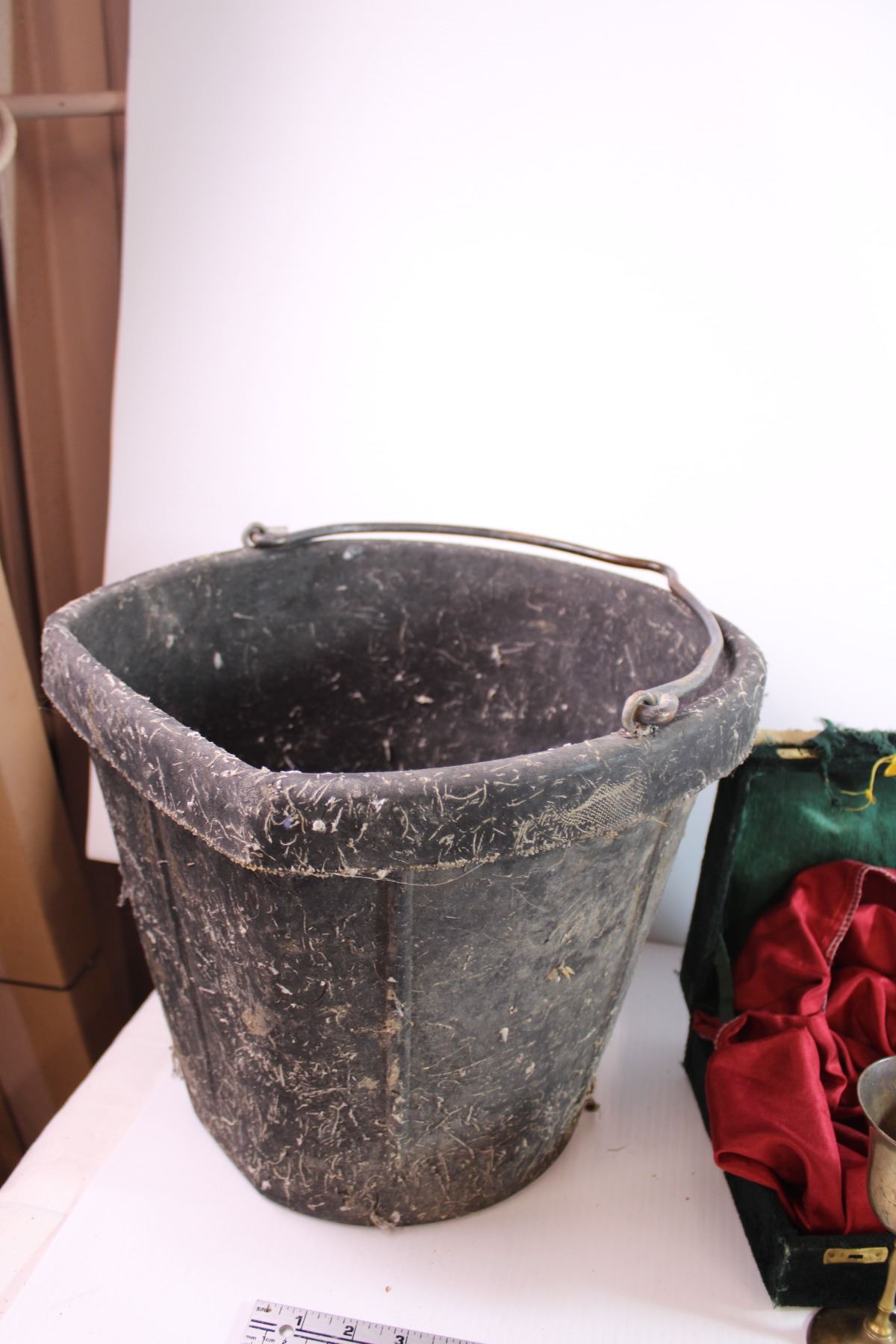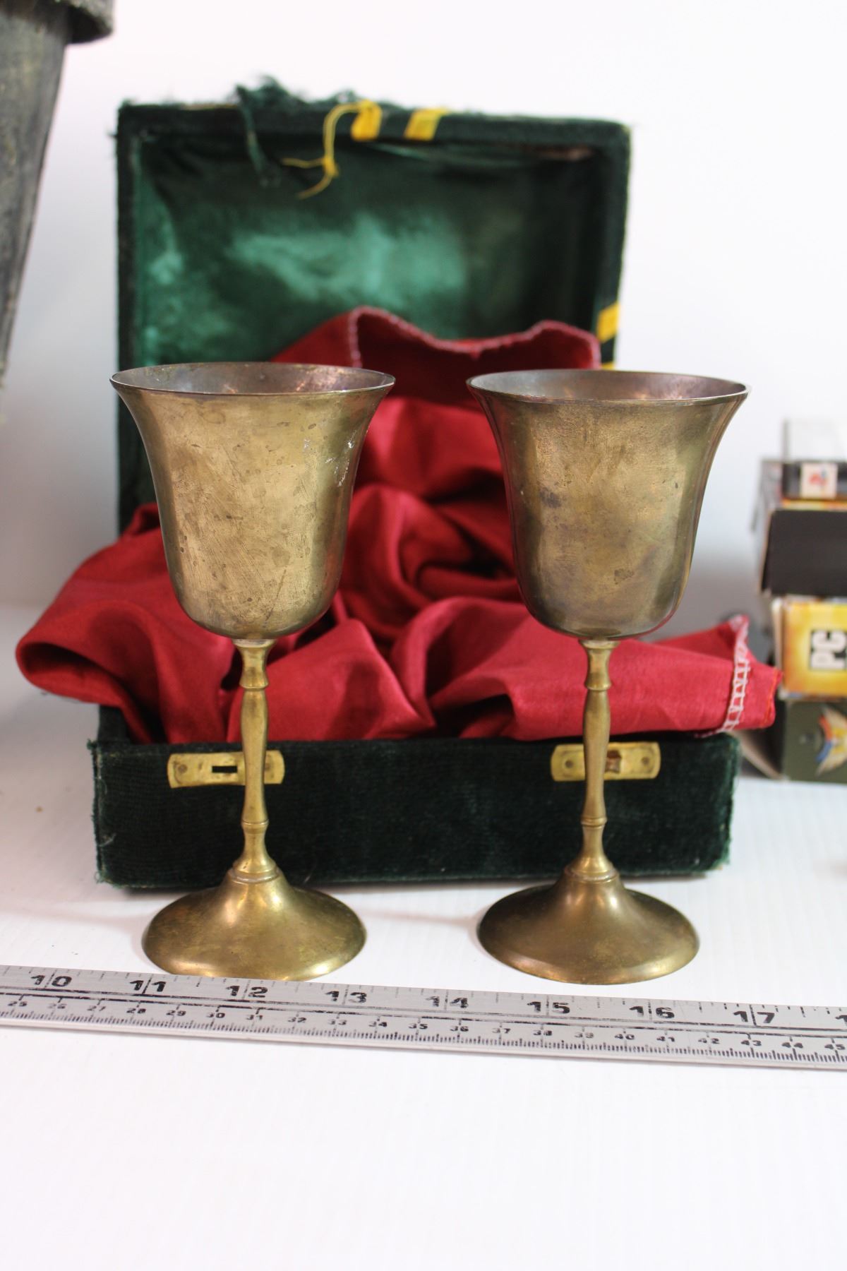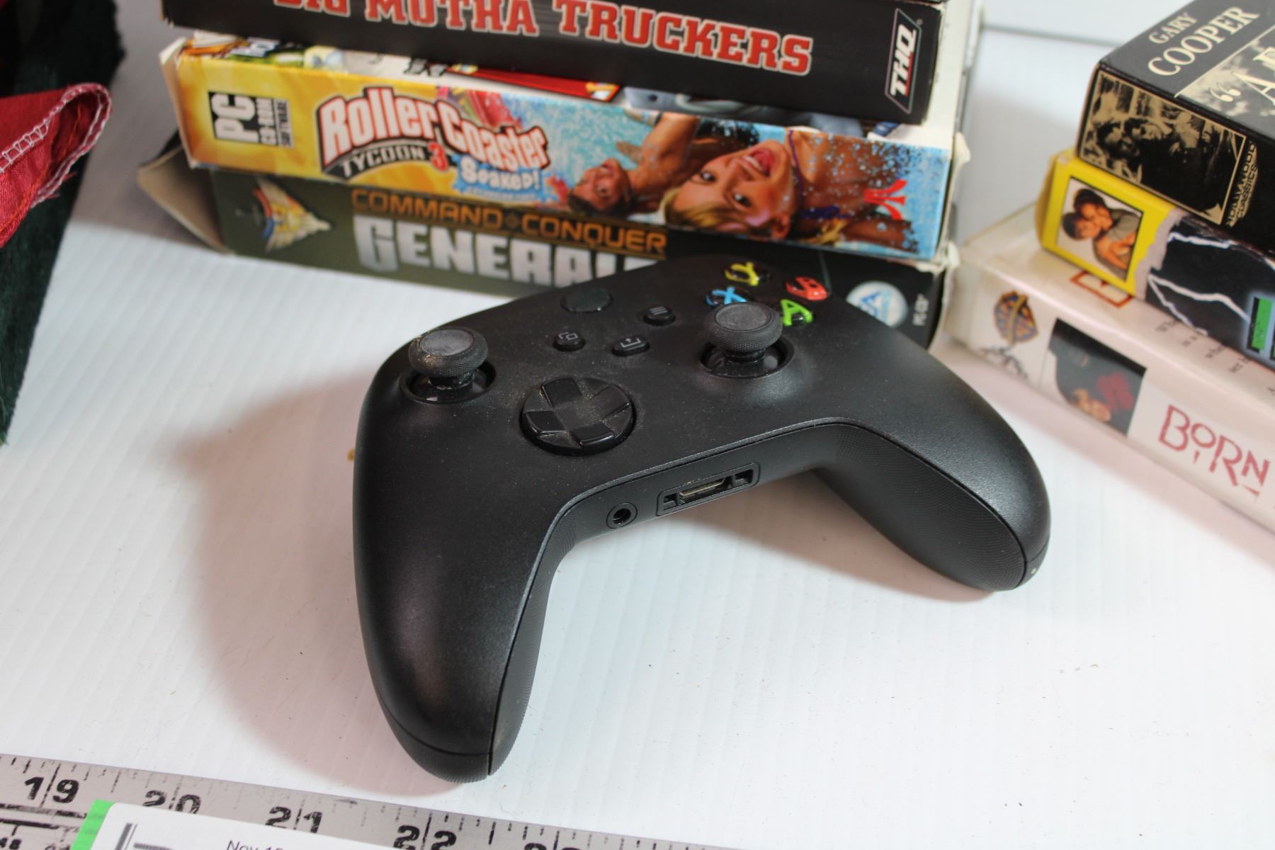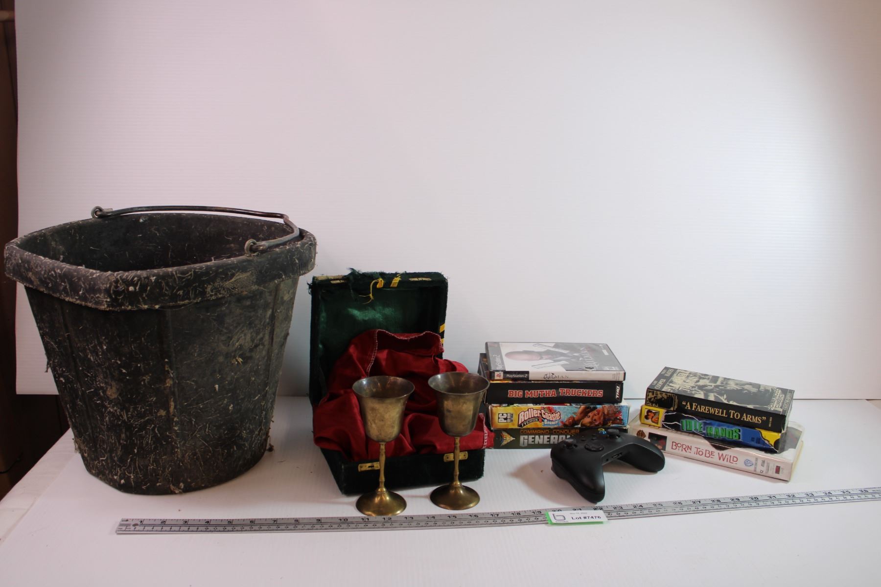 Feed Bucket, Box w/ Goblets + 3 PC Games, 1 PS2 Game, Xbox Controller, and 3 VHSs