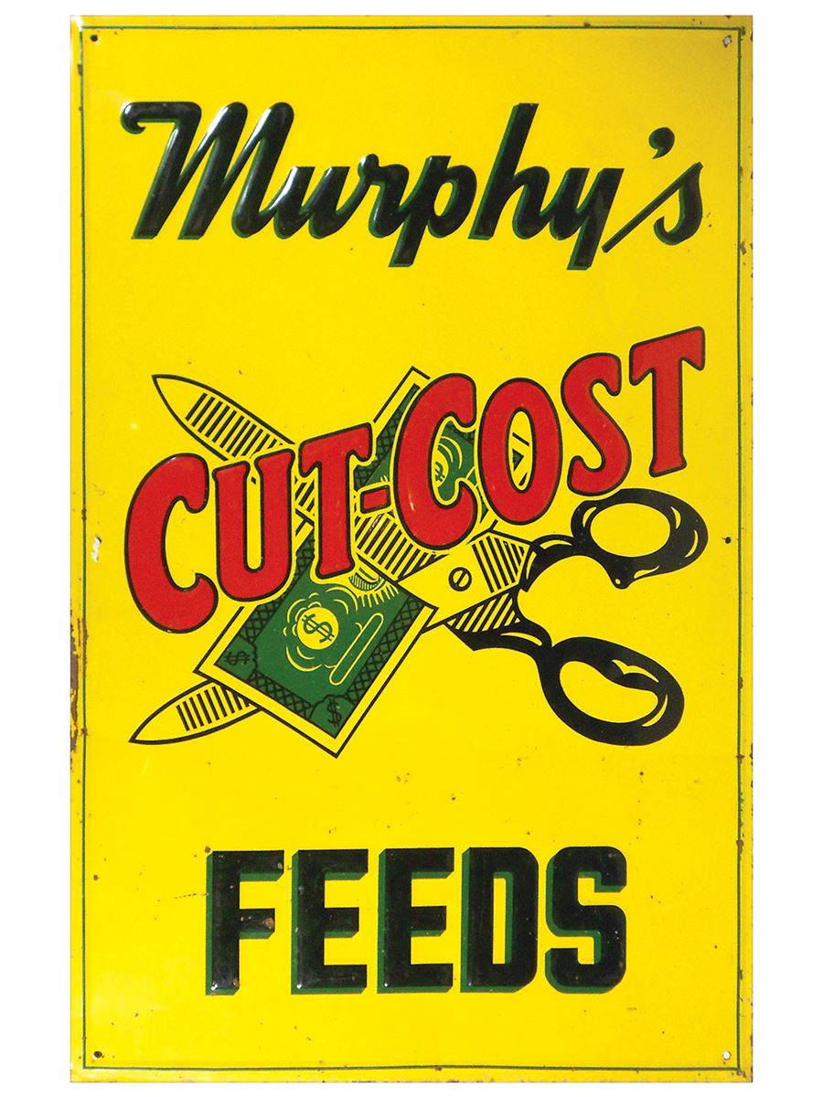 Feed sign, Murphy's Cut-Cost Feeds, 3-color, self-framed embossed metal, Good/VG cond w/nice graphic, 35"H x 23"W.